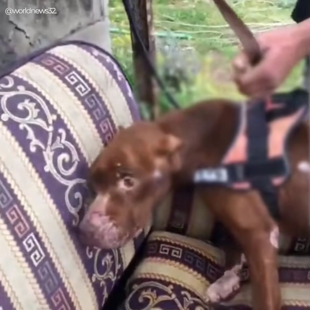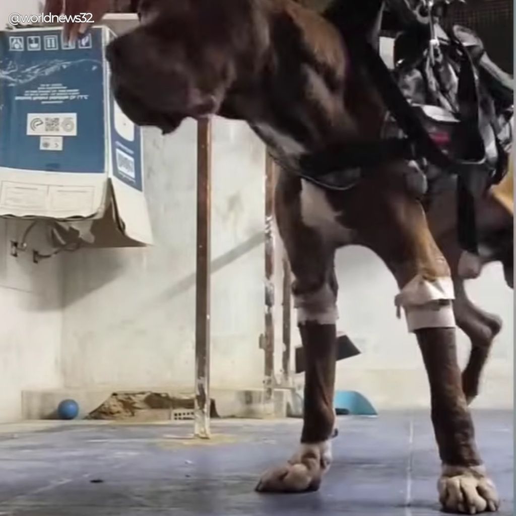 His teeth were broken and cut down, suggesting he may have been used as a hunting dog and discarded when he could no longer perform. Severe anemia further weakened him, and doctors warned that he might never walk normally again.